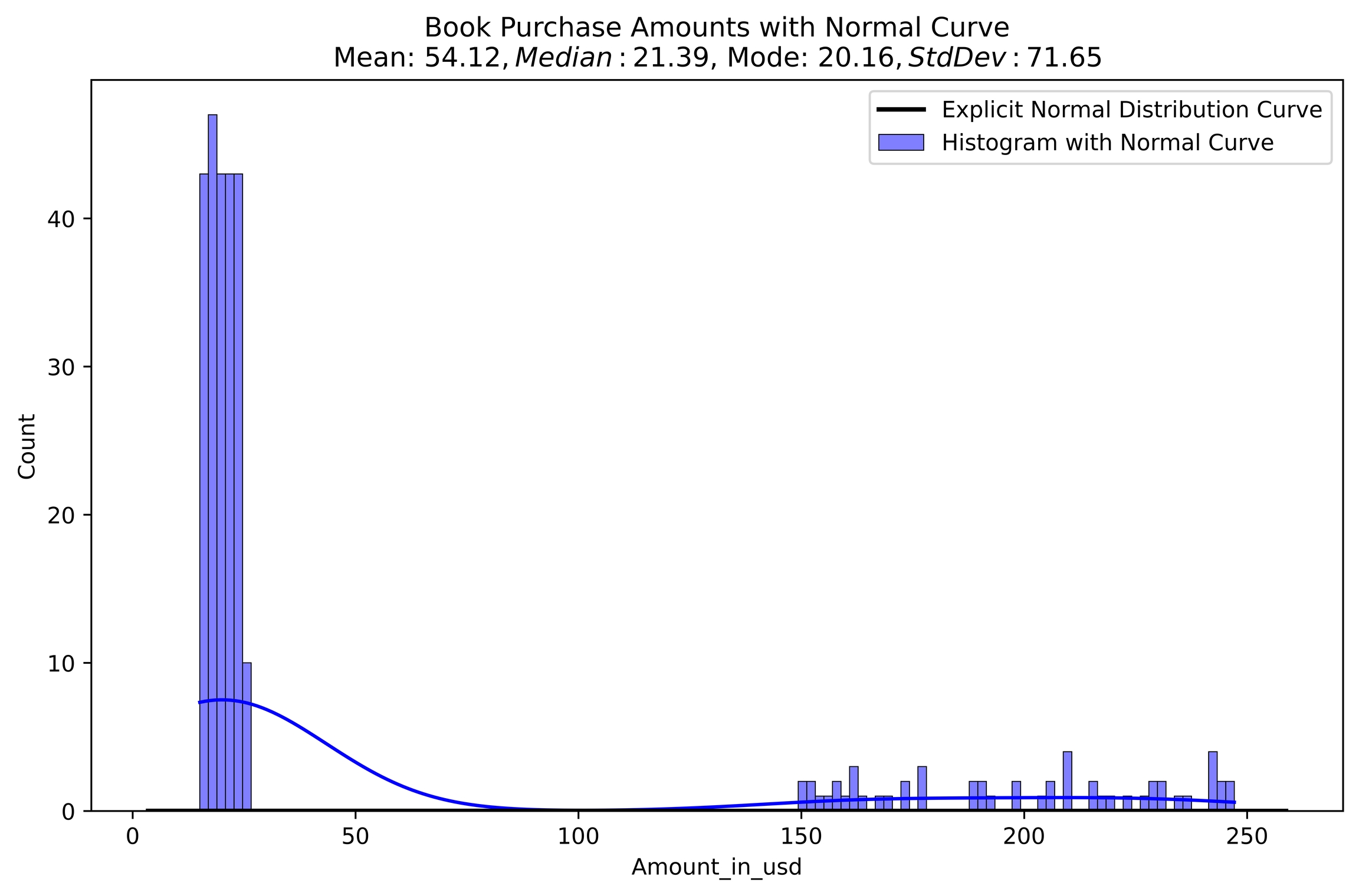 যেহেতু বিভিন্ন রিজিওনের লোকদের বইয়ের পছন্দ বিভিন্ন রকম তাই খরচের মাত্রাও সেরকম হবে। হিস্টোগ্রাম সেটি দেখাচ্ছে এবং আমরা দেখতে পাচ্ছি কার্ভটি মোটেও নরমাল ডিস্ট্রিবিউশন ফলো করেনি। ডাটা চারিদিকে ছড়ানো ছিটানো এবং এভারেজ স্পেন্ডিং মানে মিন থেকে ডিভিশন অনেক বেশি। ১০-৫০ ডলারের মধ্যে যেই বইগুলো আছে সেগুলো বিক্রির পরিমান সবচেয়ে বেশি মূল্যের বইয়ের বিক্রি কম।