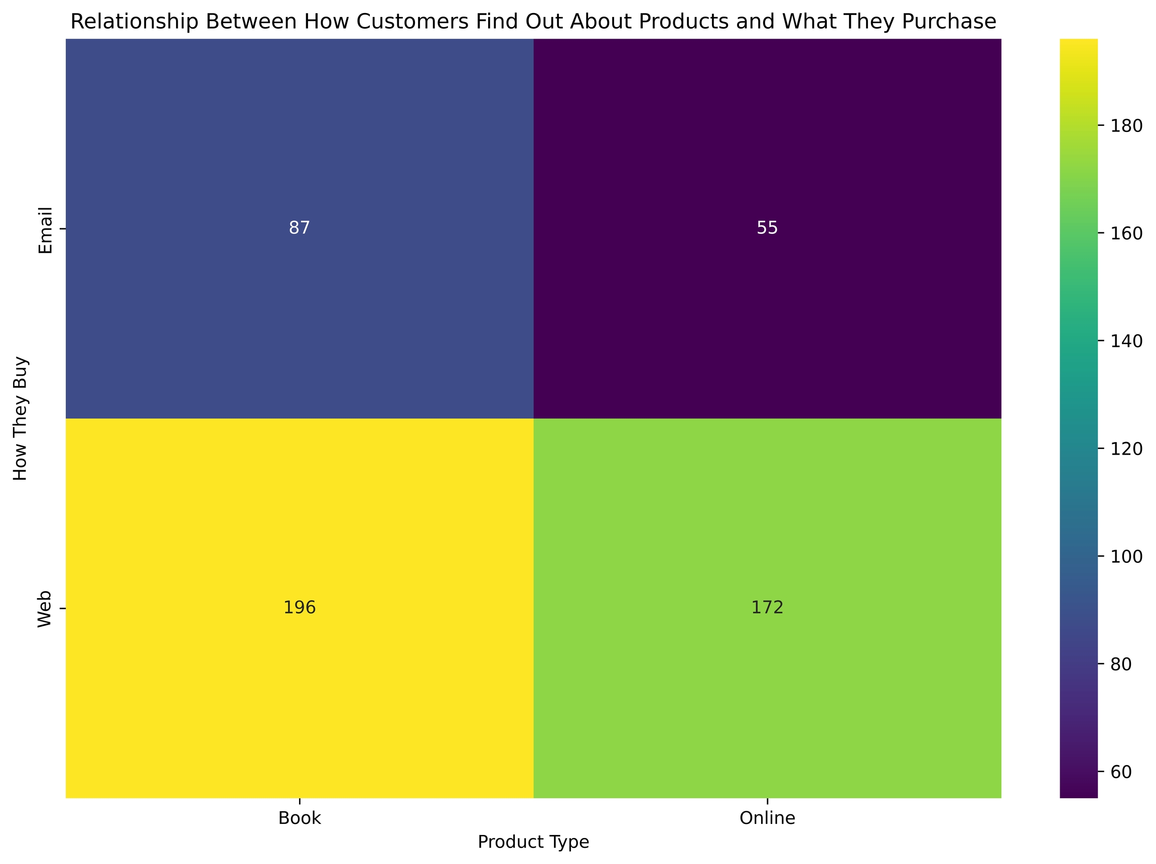 এবার সম্পর্ক খুঁজে বের করবো কাস্টমার যেভাবে কিনছেন তার সাথে যেই প্রোডাক্ট কিনছেন তার কোনো সম্পর্ক আছে কি না ? এখানে প্রোডাক্ট বলতে বই এবং অনলাইন প্রোডাক্ট এবং যেভাবে কিনছেন বলতে ইমেল এবং ওয়েব কে মাদ্ধমে হিসেবে দেখানো হয়েছে ডাটাসেট অনুযায়ী