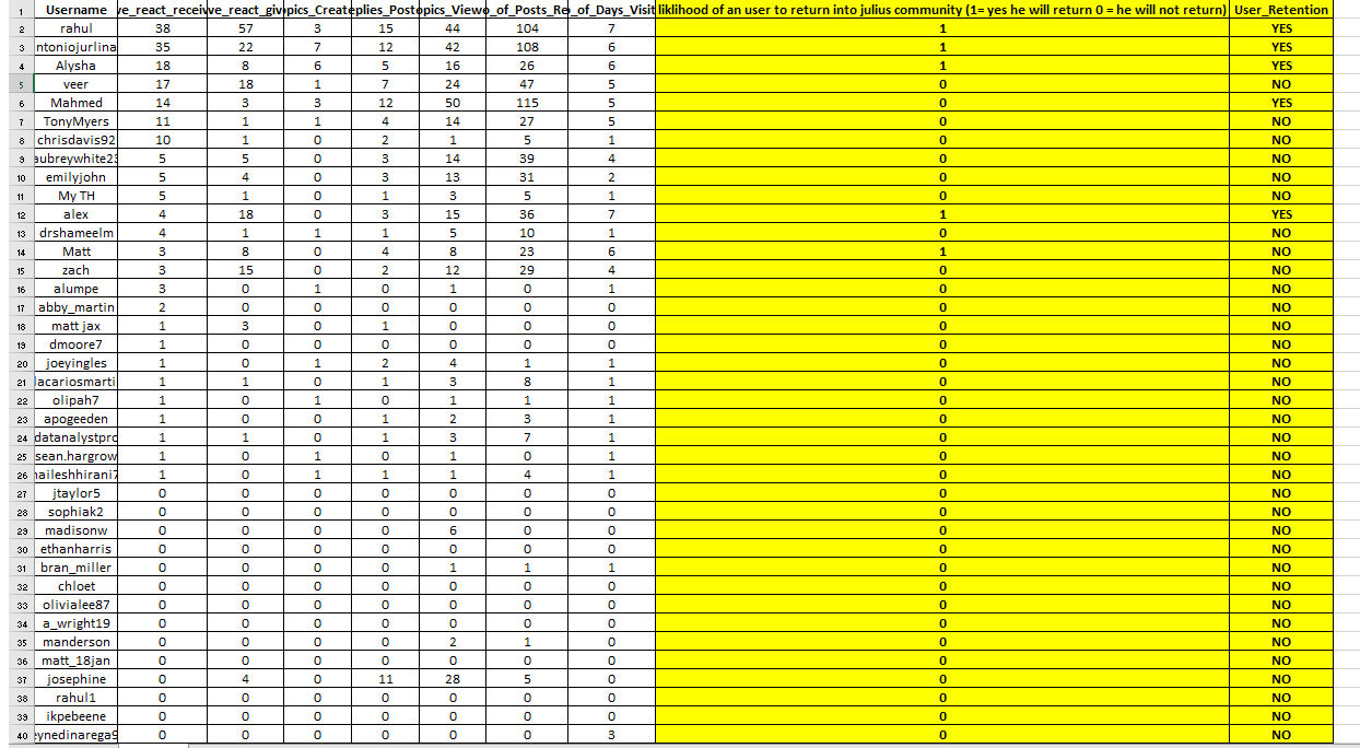 সেটি দেখানোর জন্য আমি নিয়েছি [জুলিয়াস](https://julius.ai/?via=theorex) এর অনলাইন ফোরামের টপ ৪২ জনের ইউজার দের রিয়েল লাইফ ডাটা। চলুন একটি দেখে নেই ডাটাসেটটি